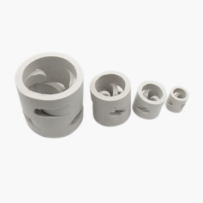 陶瓷鮑爾環(huán)填料是在陶瓷拉西環(huán)的基礎(chǔ)上開發(fā)的一種高徑相等的開孔環(huán)型填料,每層窗孔有5個(gè)舌葉,每個(gè)舌葉內(nèi)彎指向環(huán)心,上下兩層窗孔的位置相反錯(cuò)開,一般開孔面積約占環(huán)壁總面積的30%左右,使得填料塔內(nèi)的氣體和液體能夠從窗孔自由通過,改善了氣液分布,充分利用了環(huán)的內(nèi)表面。