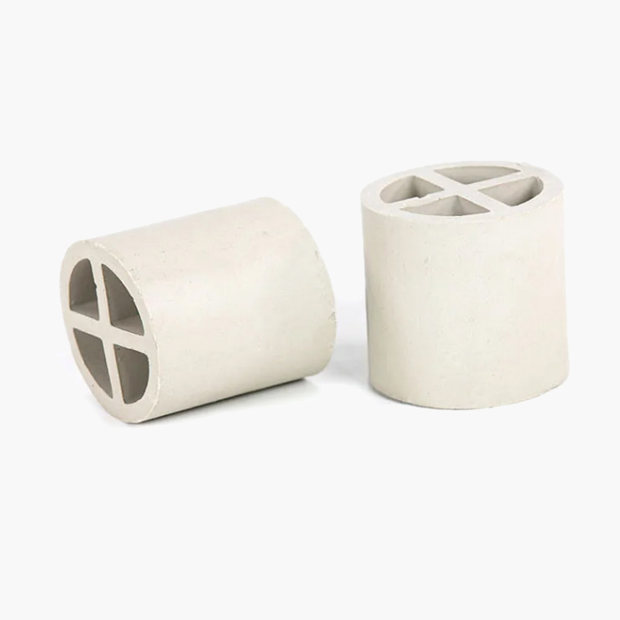 陶瓷十字隔板環(huán)填料是基于增加填料的比表面積,從而強化傳質(zhì)效率而開發(fā)出來的。 其形狀是在拉西環(huán)中間增設(shè)了十字隔板。 一般來講,這種填料由于尺寸較大,僅適用于整體堆徹,目前一般只作為亂堆填料的塔底支撐分布層用。