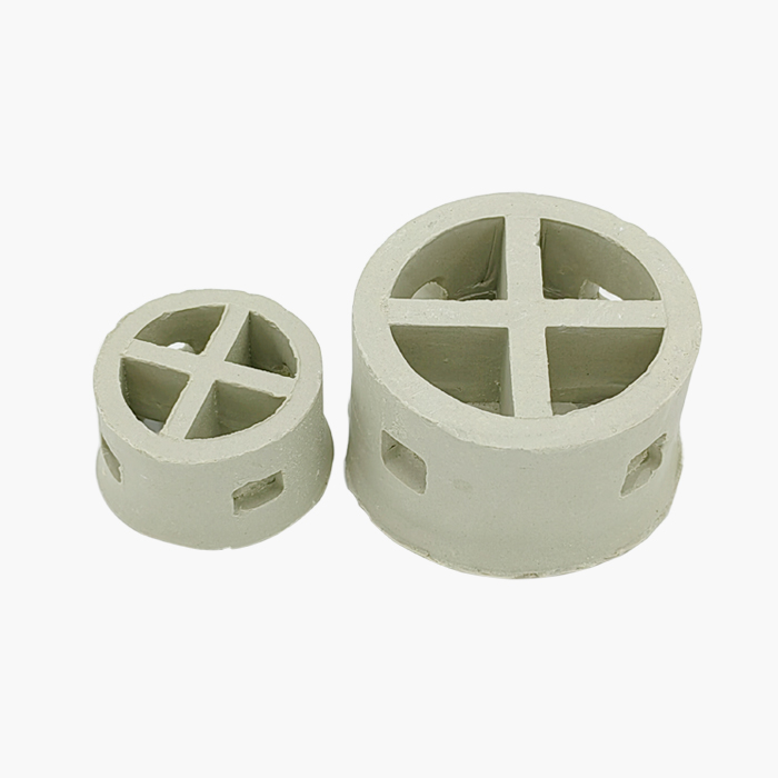 陶瓷階梯環(huán)吸收了短拉西環(huán)的特點,也改變了填料的環(huán)高與直徑相等的習(xí)慣,降低了環(huán)的高度,減薄了材質(zhì)的厚度,并在環(huán)的側(cè)端增加了翻邊。