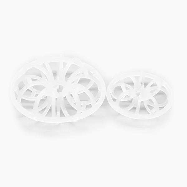 塑料花環(huán)填料也稱梅花環(huán)填料,泰勒花環(huán)填料,污水處理花環(huán)填料等,該填料是由許多圓環(huán)結(jié)繞而成,就像雙圓花環(huán),具有抗壓強度高,填料之間相互重疊小、比表面積大、流體阻力壓降小,能耗低、操作費用低、重量輕、易裝卸、可重復(fù)使用,塔內(nèi)不易堵塞,分離效果好,使用壽命長。